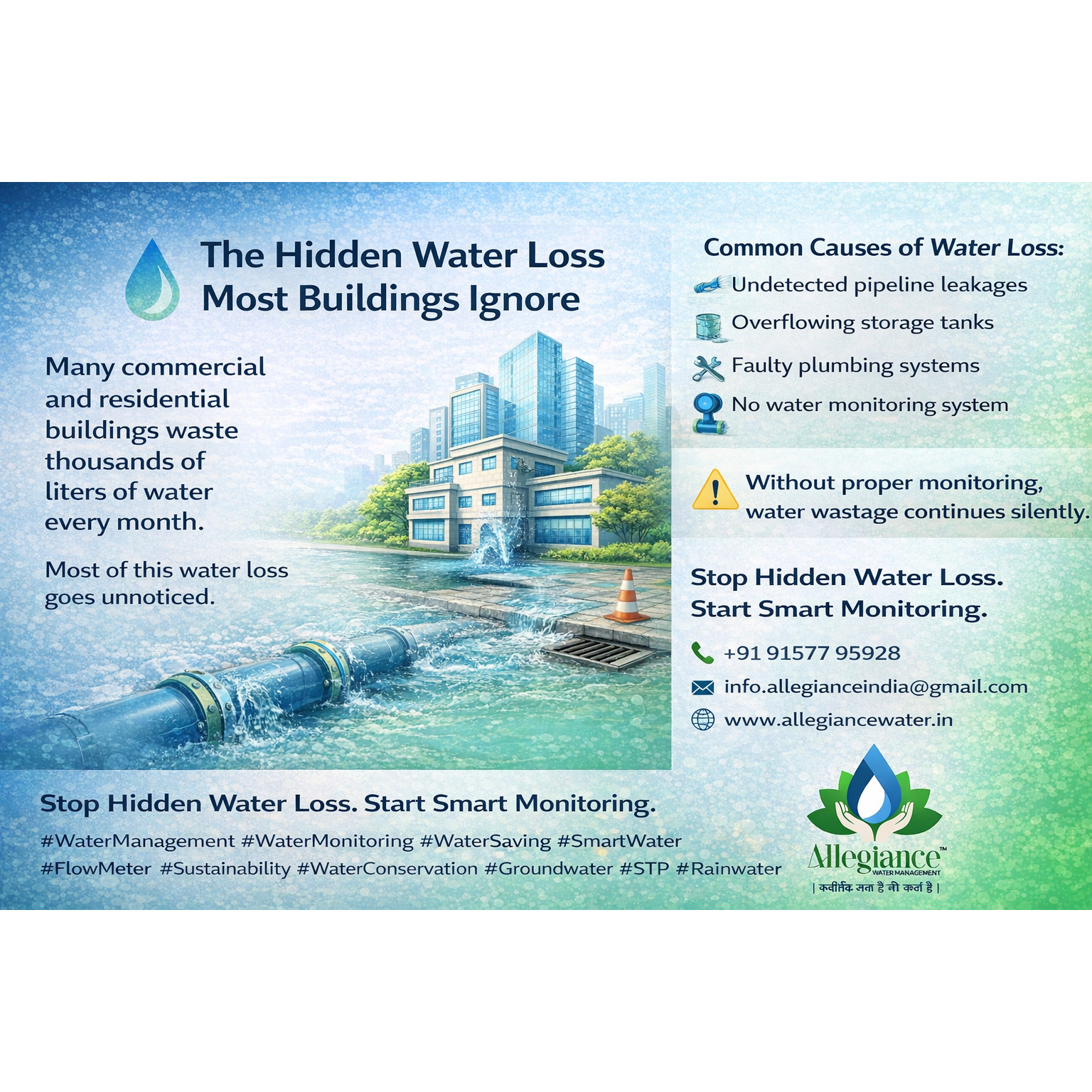 Water loss in commercial and residential buildings is a common but often unnoticed problem. Undetected pipeline leakages, overflowing tanks, faulty plumbing systems, and the absence of proper water monitoring systems can lead to thousands of liters of water being wasted every month. This not only increases water bills but also leads to resource wastage and operational inefficiency.