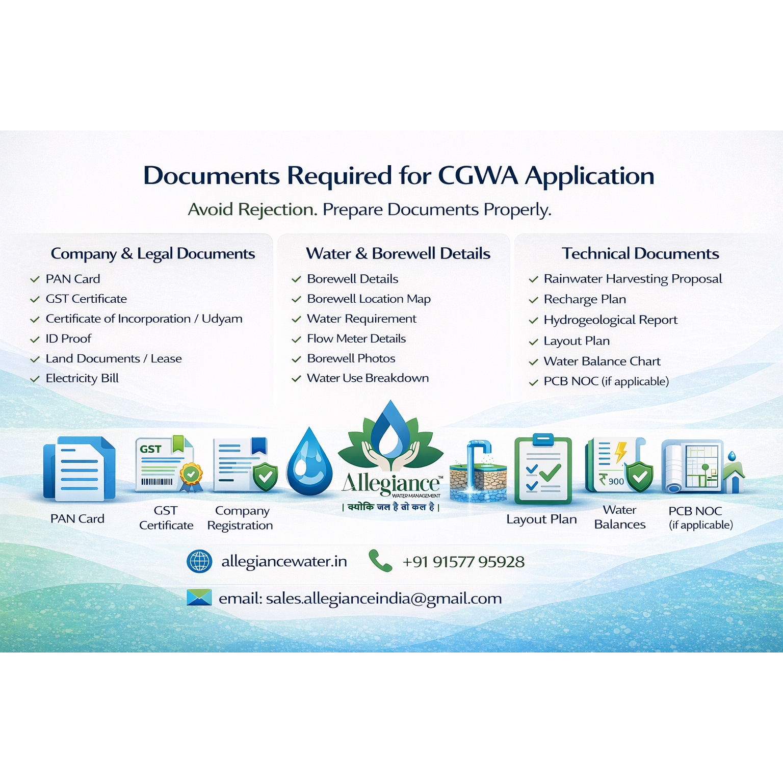 At Allegiance Water Management, we assist industries in preparing complete CGWA documentation, including hydrogeological reports, rainwater harvesting proposals, recharge plans, water balance charts, and compliance documentation.