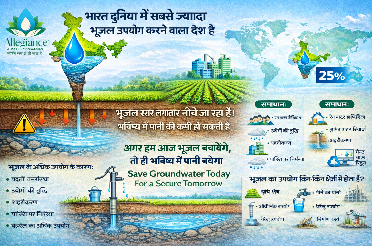 India is the largest user of groundwater in the world, using more than 25% of the global groundwater resources. Groundwater is widely used for drinking water, agriculture, industrial processes, domestic use, and construction activities. Due to increasing population, rapid urbanization, industrial growth, and excessive borewell usage, groundwater levels are continuously declining in many parts of the country.