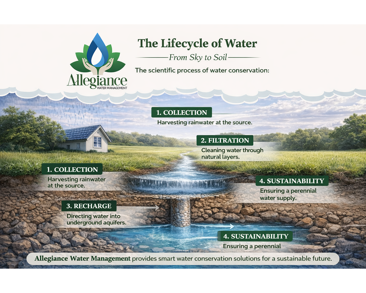This system follows a scientifically proven lifecycle of water, where rainfall is responsibly returned to the earth after controlled treatment—mimicking natural hydrological processes while enhancing efficiency.